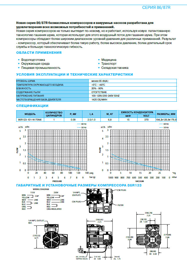 1100 л/ч при противодавлении 3 бар – для модели GAST 86R123